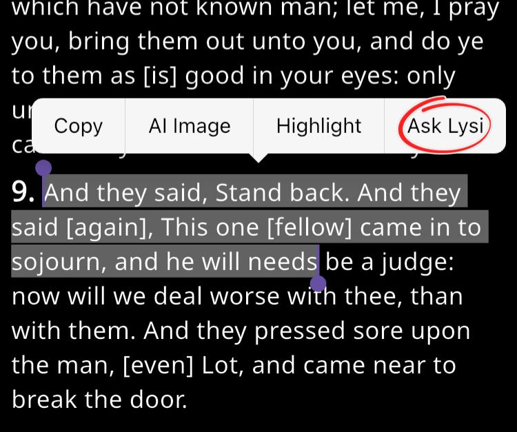 Ask Lysi for study help, reading suggestions, or quick devotional prompts. Lysi remembers session context during a conversation.