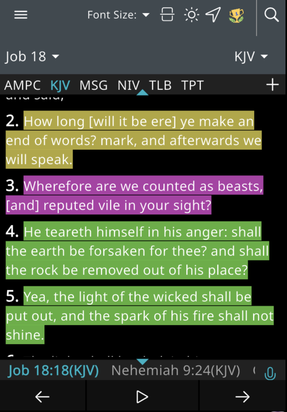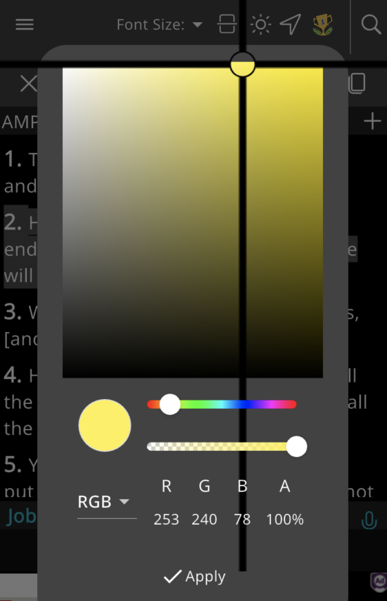 Tip: For readable text, Multiverse Bible automatically selects white or black text depending on highlight color contrast.