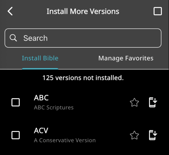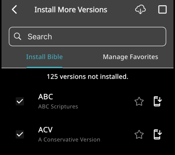 - Use the search bar to find the Bible versions you want, then tap the Install button beside each version.