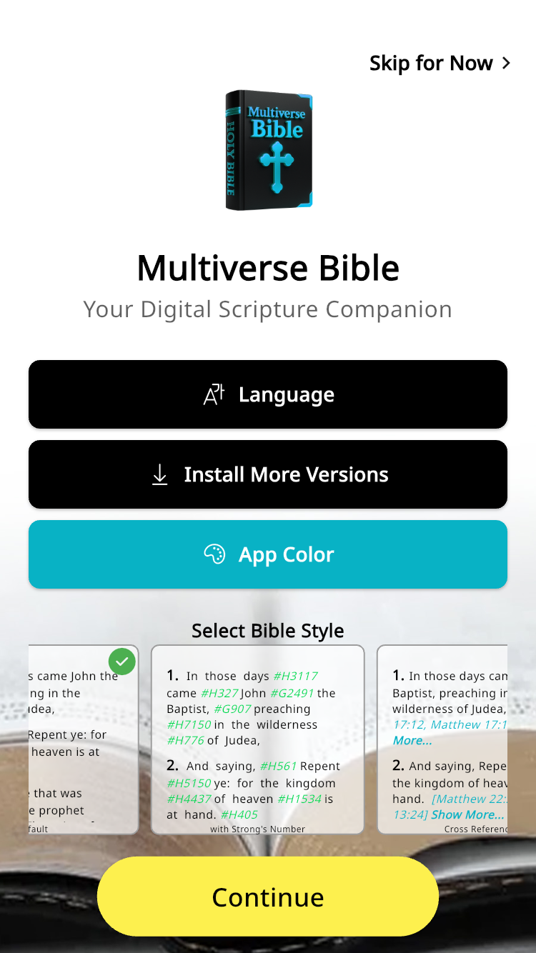 Install Multiverse Bible from Google Play or the App Store, then sign in or continue as a guest.